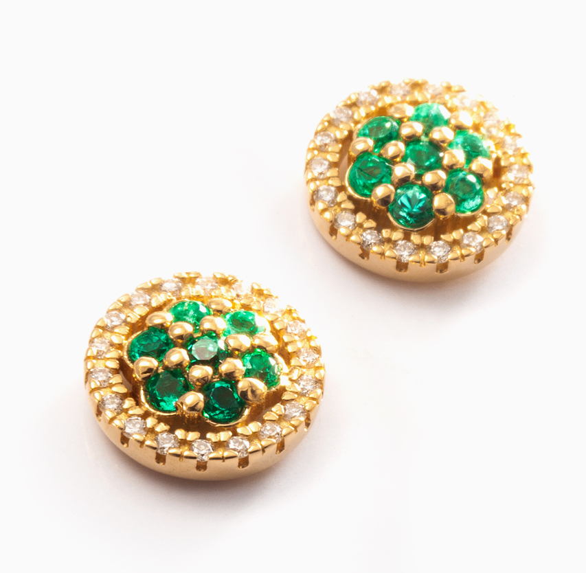Un diseño que enamora por su romanticismo, aretes en oro con diamantes y esmeraldas que los hacen únicos para ti.